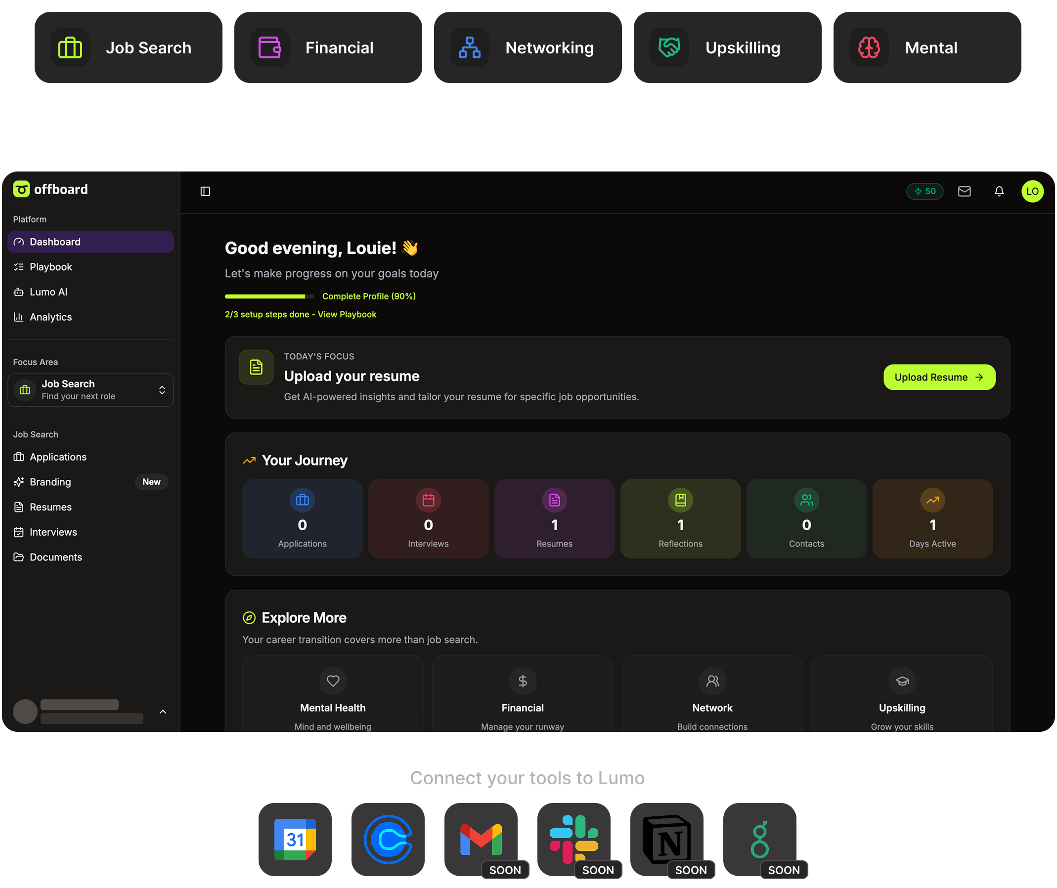 Chat with LUMO anytime, or reach out to the Offboard community within the app and/or in Slack. You can also reach out to our team via the Help page. We're building this alongside job seekers like you.